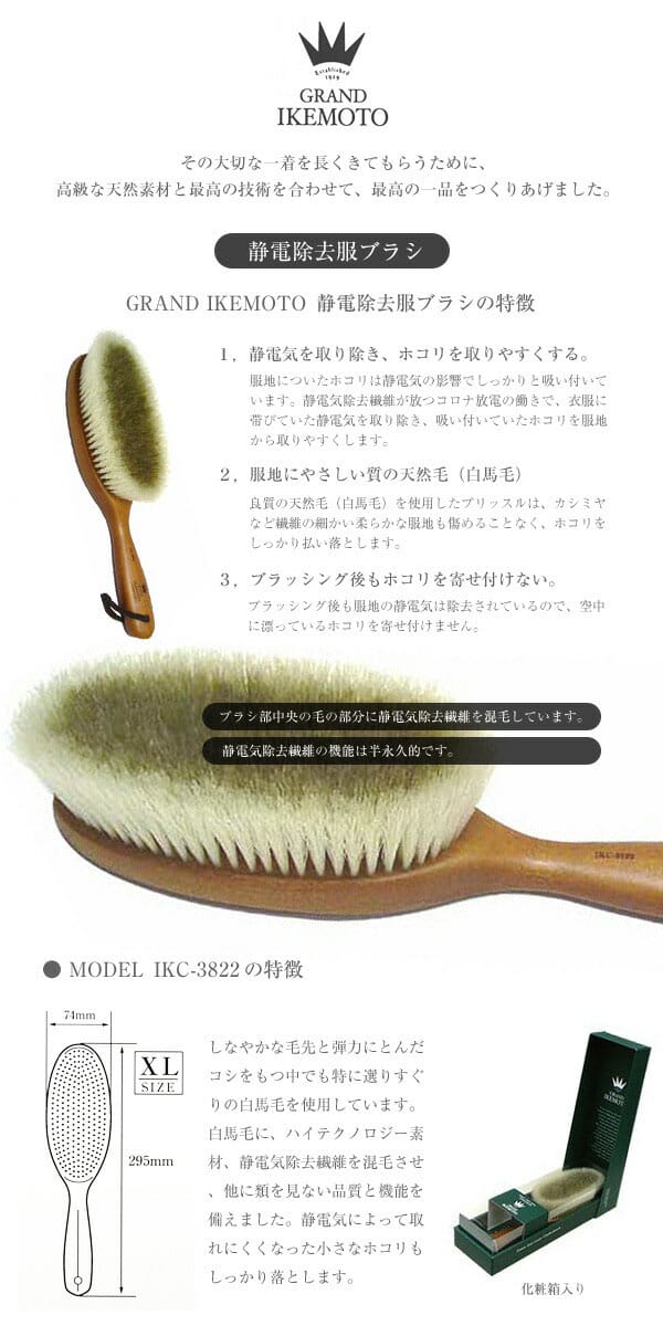 GRAND IKEMOTO グランドイケモト 洋服ブラシ XL IKC-3822 厳選した高級白馬毛に静電気除去繊維を一体化させた衣服専用のブラシ!! ●静電気を取り除きホコリを寄せ付けない 天然毛に静電気除去繊維(銅イオン含浸アクリル繊維)を混毛しているので、ブラッシングするだけで静電気を取り除きホコリを取りやすくします。