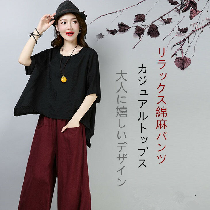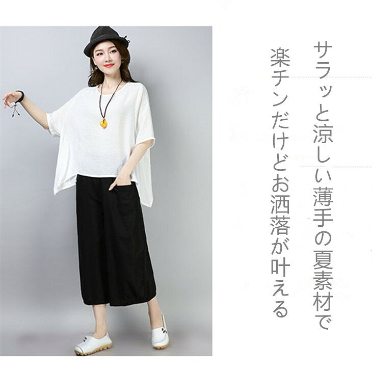 【メール便 送料無料】レディース綿麻2点セット半袖トップスワイドパンツ レディース 可愛い 綿麻シャツ 薄手で透け感のある綿麻2点セット 夏涼しく薄手綿麻セット 無地