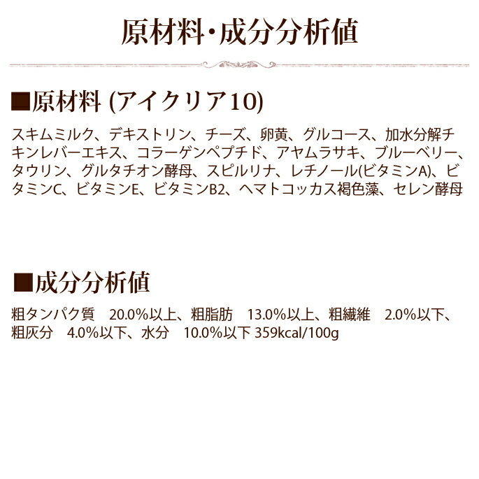 ■■保証分析値■■ 粗タンパク質 20.0%以上、粗脂肪 13.0%以上、粗繊維 2.0%以下、粗灰分 4.0%以下、水分 10.0%以下 359kcal/100g ■■原材料■■ スキムミルク、デキストリン、チーズ、卵黄、グルコース、加水分解チキンレバーエキス、コラーゲンペプチド、アヤムラサキ、ブルーベリー、タウリン、グルタチオン酵母、スピルリナ、レチノール(ビタミンA)、ビタミンC、ビタミンE、ビタミンB2、ヘマトコッカス褐色藻、セレン酵母 ■■給与量目安■■ 〜10kg 1包(1日) 10〜20kg 2包(1日) 20kg〜 3包(1日) いつものフードにふりかけたり、水やぬるま湯に溶かして与えてください。